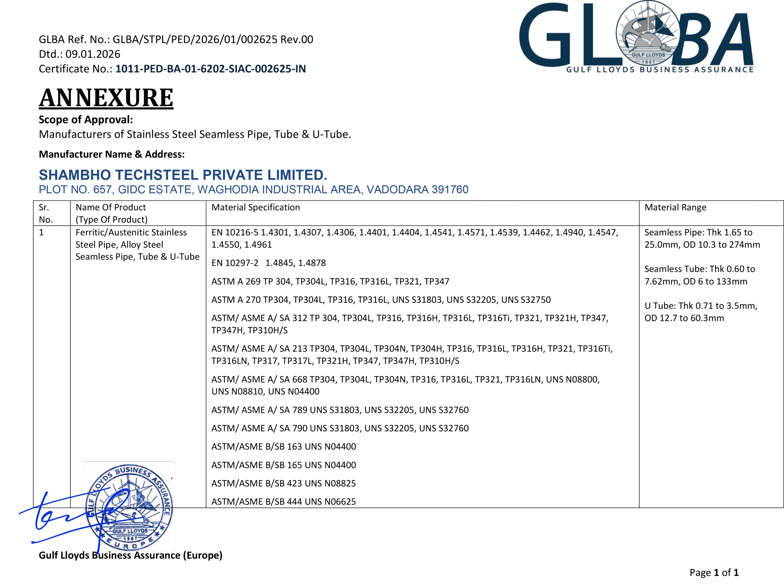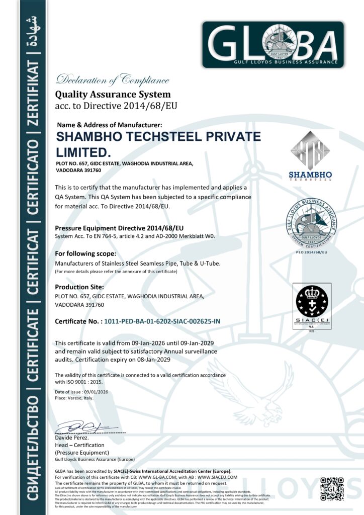 Shambho Techsteel complies with the Pressure Equipment Directive 2014/68/EU, ensuring that our manufacturing processes and products meet stringent European quality and safety standards.