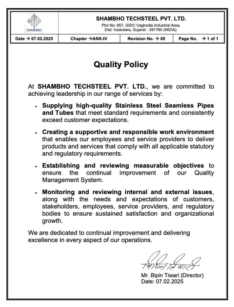 At Shambho Techsteel, quality management is integral to our commitment to delivering dependable stainless steel seamless pipes and tubes. We uphold rigorous quality standards, ensuring each order meets the client’s needs by following stringent criteria for reliability, durability, and consistency. Our experienced quality assurance team, comprising skilled engineers and technicians, meticulously oversees every production stage using advanced inspection tools and precision testing instruments. By sourcing premium-quality raw materials exclusively from trusted suppliers, we ensure that our clients receive consistently superior steel solutions tailored to their specific industrial needs. Our relentless focus on quality drives our reputation as a trustworthy and efficient business partner.