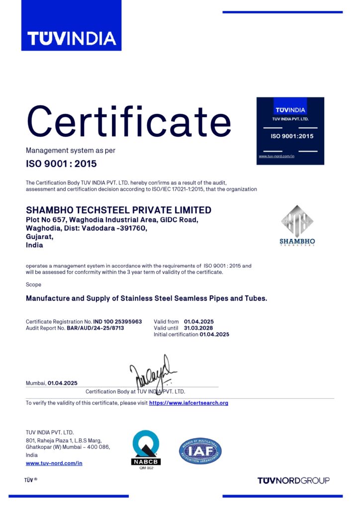 We are ISO 9001:2015 certified, highlighting our commitment to consistent quality, customer satisfaction, and continual improvement in the manufacture and supply of stainless steel seamless pipes and tubes.
